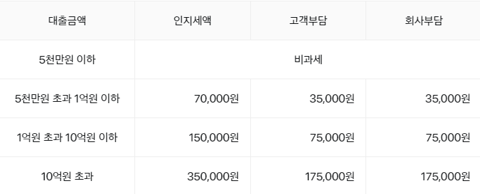 인지세법에 의해 5천만원 초과 대출시 대출금액에 따라 세액이 차등 적용되며,각 50%씩 고객과 회사가 부담합니다.