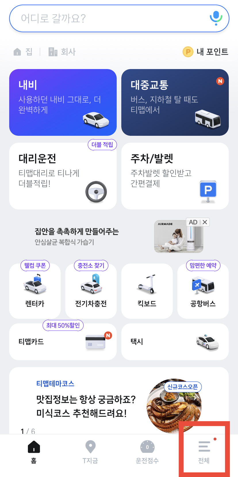티맵 앱 초기 화면에서 오른쪽 아래의 전체 메뉴 버튼을 누릅니다.