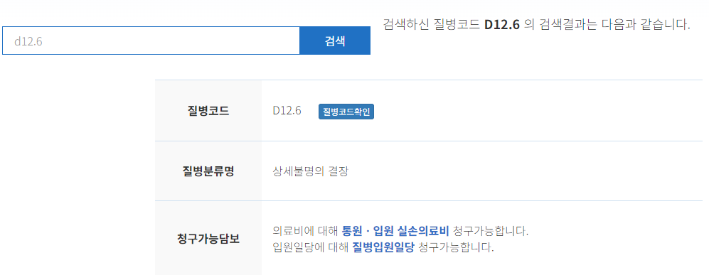 위 진단서에 나온 d12.6을 검색해 보았습니다. 질병분류명은 상세불명의 결장이며, 청구가능담보 의료비에 대해 통원ㆍ입원 실손의료비, 입원일당에 대해 질병입원일당 청구가능하다고 나오네요. 정말 편리한 기능이죠!