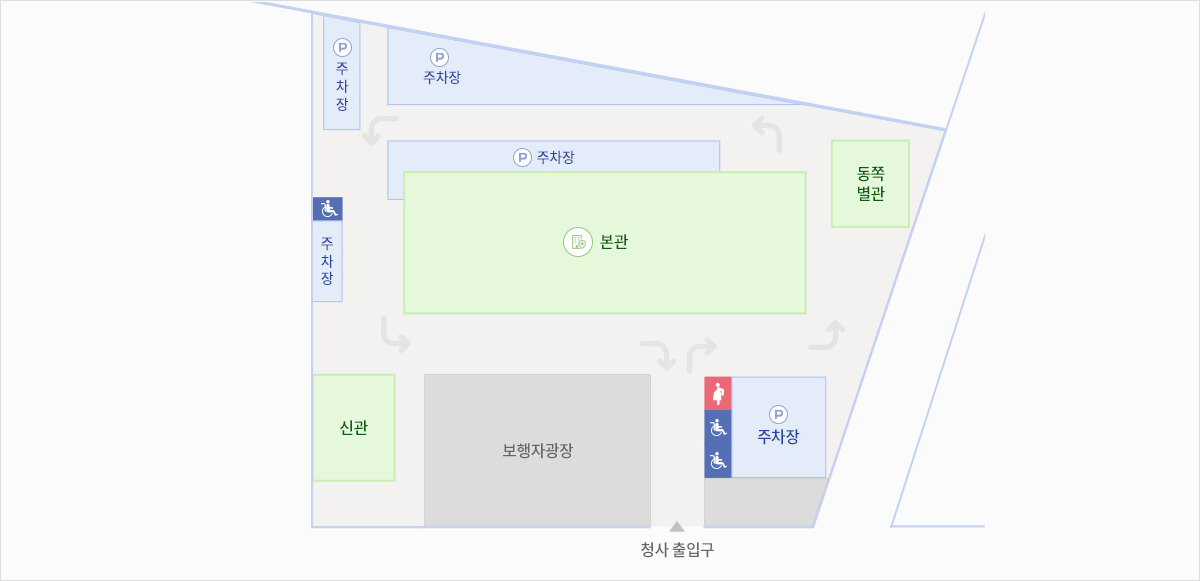 청사 1층 주차장: 장애인전용, 임산부전용, 경로전용 등 민원인용 주차장 운영 중