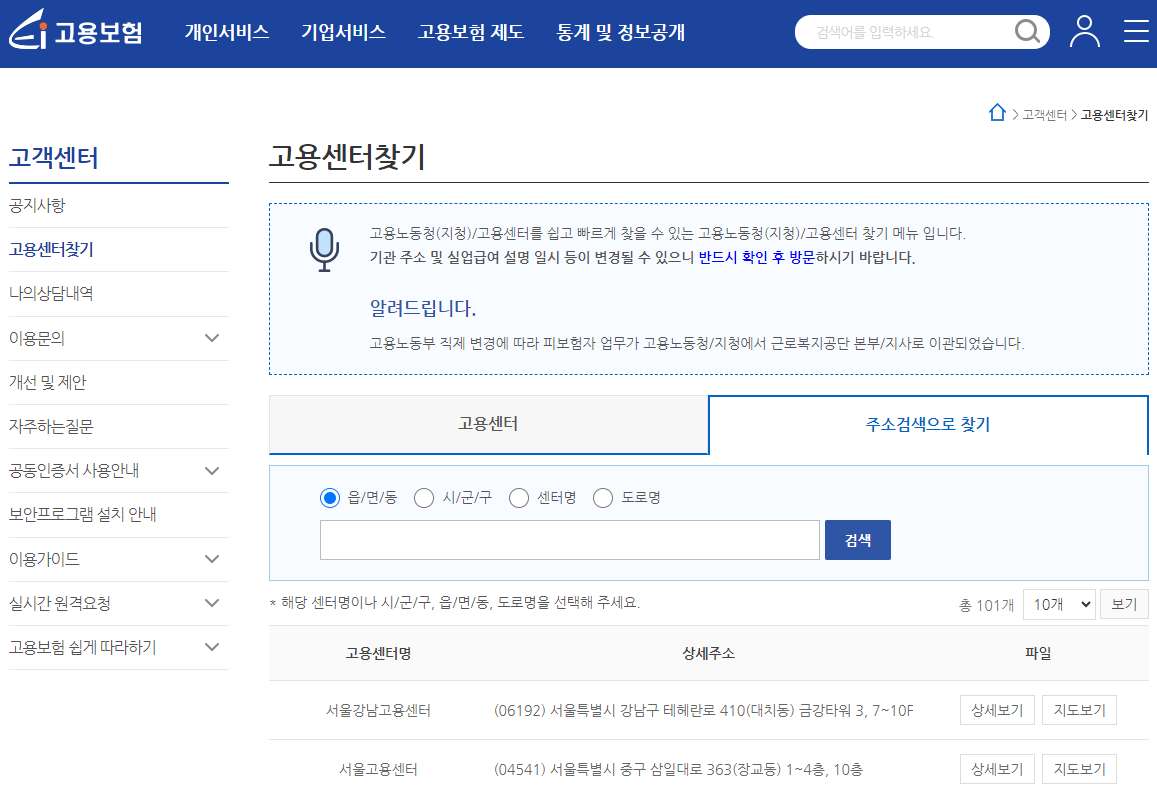 고용지원센터는 [고객센터]->[고용지원센터찾기] 메뉴를 이용하시어 확인하실 수 있습니다.