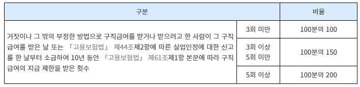 거짓이나 그 밖의 부정한 방법으로 실업급여를 지급받은 자는 실업급여 수급액의 반환 뿐 아니라 거짓이나 그 밖의 방법으로 지급받은 실업급여액에 다음의 구분에 따른 비율을 곱한 금액이 징수됩니다.