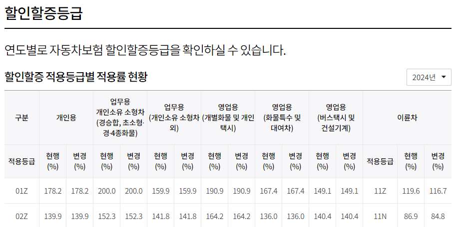 - 현행은 2024.01.01부터, 변경은 2024.02.01부터 적용하는 할인할증등급별 적용률입니다.