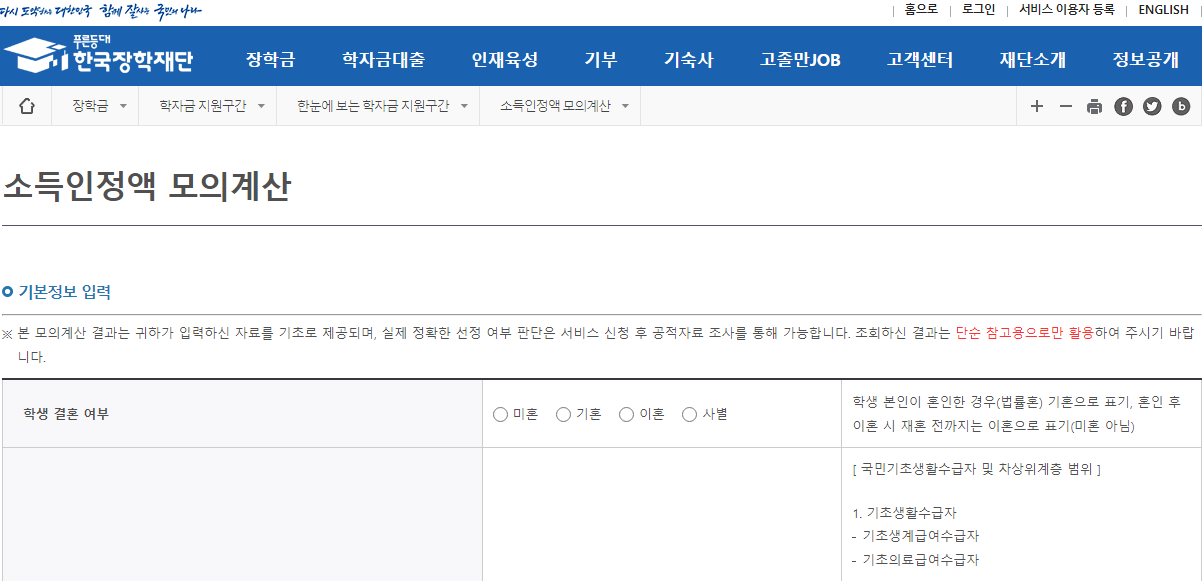 한국장학재단에서는 국가장학금 소득인정액을 추정할 수 있도록 도움을 드리기 위해 모의 계산을 제공하고 있습니다. 단, 모의계산 결과와 실제 조사된 결과는 다를 수 있으니 주의하시길 바랍니다.