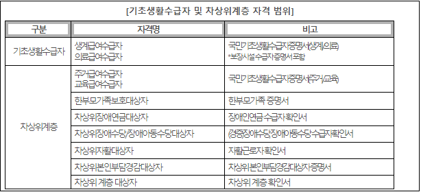 별도의 소득·재산 조사 없이 기초생활수급자 자격만으로 학자금지원여부가 결정됩니다. 재단에서는 기초생활수급자 또는 차상위계층(재단이 정하는 6가지 자격에 한함)인 경우, 별도의 소득·재산 조사를 실시하지는 않습니다.