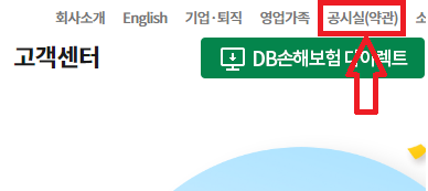 보험사 메인 화면에서 공시실(약관)을 클릭합니다.