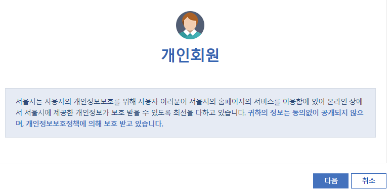 서울시는 사용자의 개인정보보호를 위해 사용자 여러분이 서울시의 홈페이지의 서비스를 이용함에 있어 온라인 상에서 서울시에 제공한 개인정보가 보호 받을 수 있도록 최선을 다하고 있습니다. 귀하의 정보는 동의없이 공개되지 않으며, 개인정보보호정책에 의해 보호 받고 있습니다. 다음을 클릭합니다.