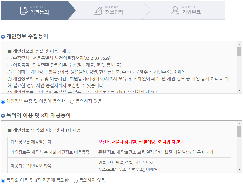 약관 동의 화면입니다. 보건소, 서울시 심뇌혈관질환예방관리사업 지원단에 개인 정보를 제공하는군요.