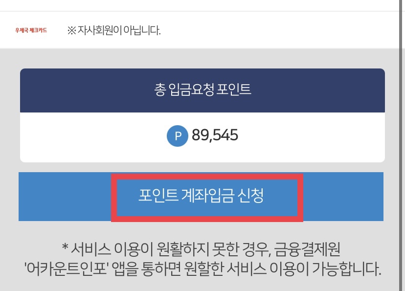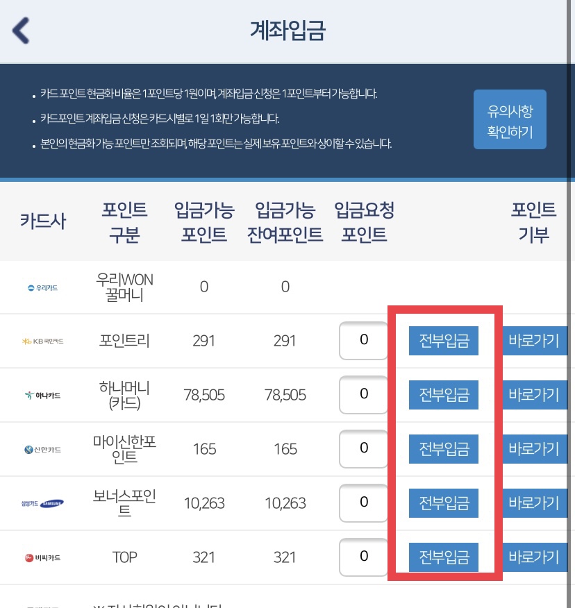 신용카드사 등에 적립된 본인 명의의 현금화 가능 포인트를 본인이 원하는 계좌(본인 명의)로 일괄 입금 신청하는 서비스
