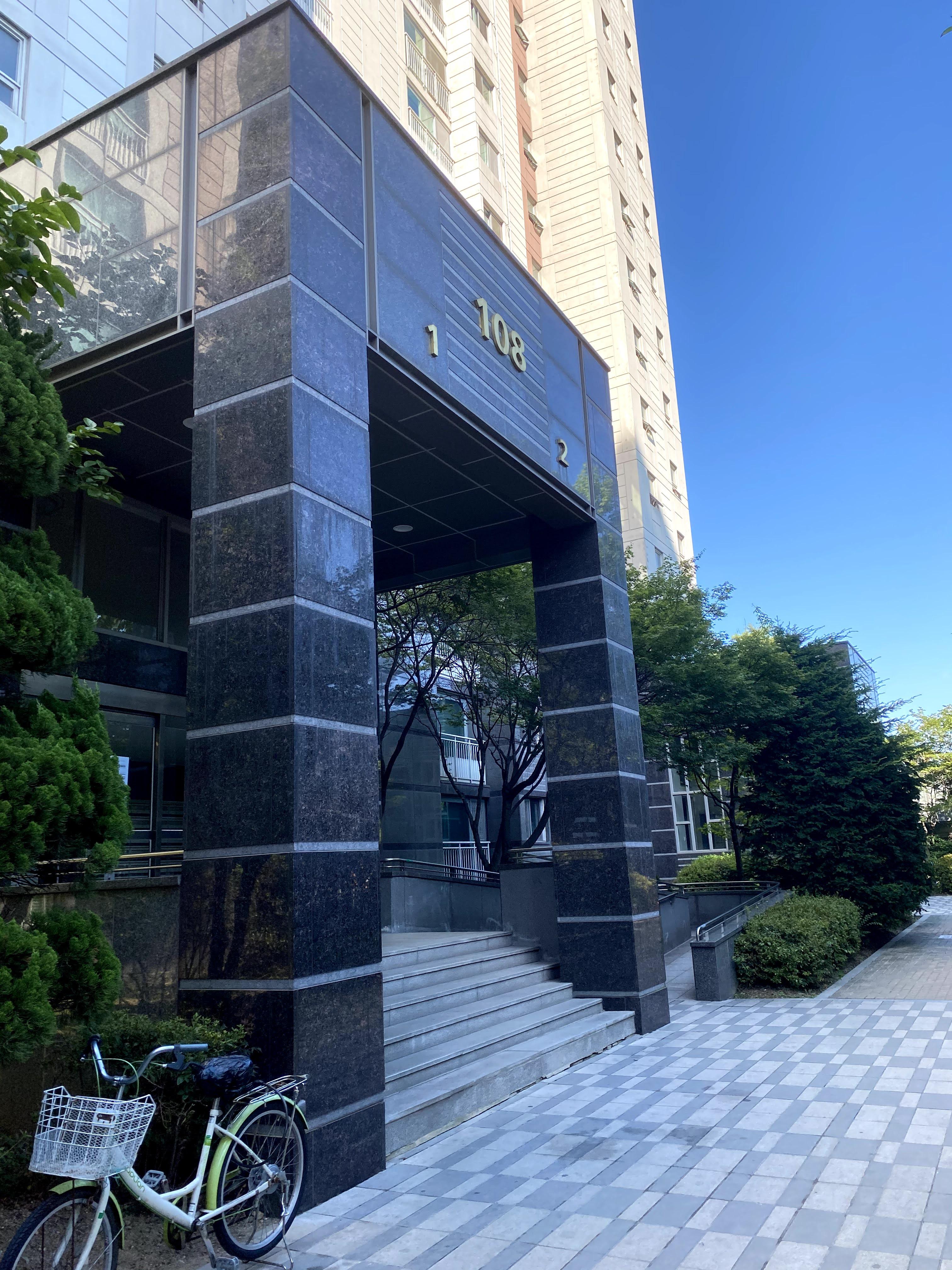 파크리오 1단지 108동의 입구입니다. 라인당 엘리베이터가 두 대 있기 때문에 이동에 편합니다.