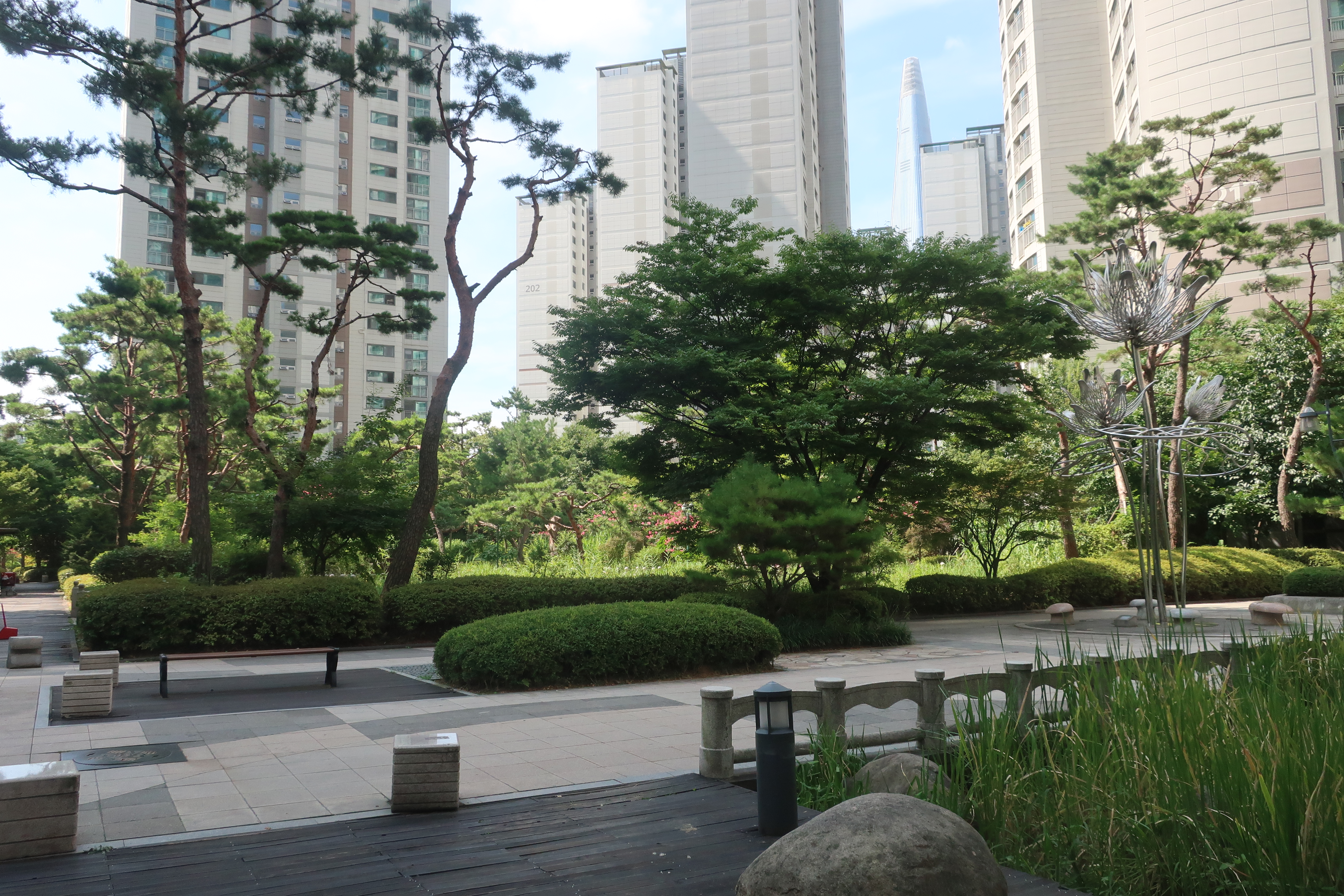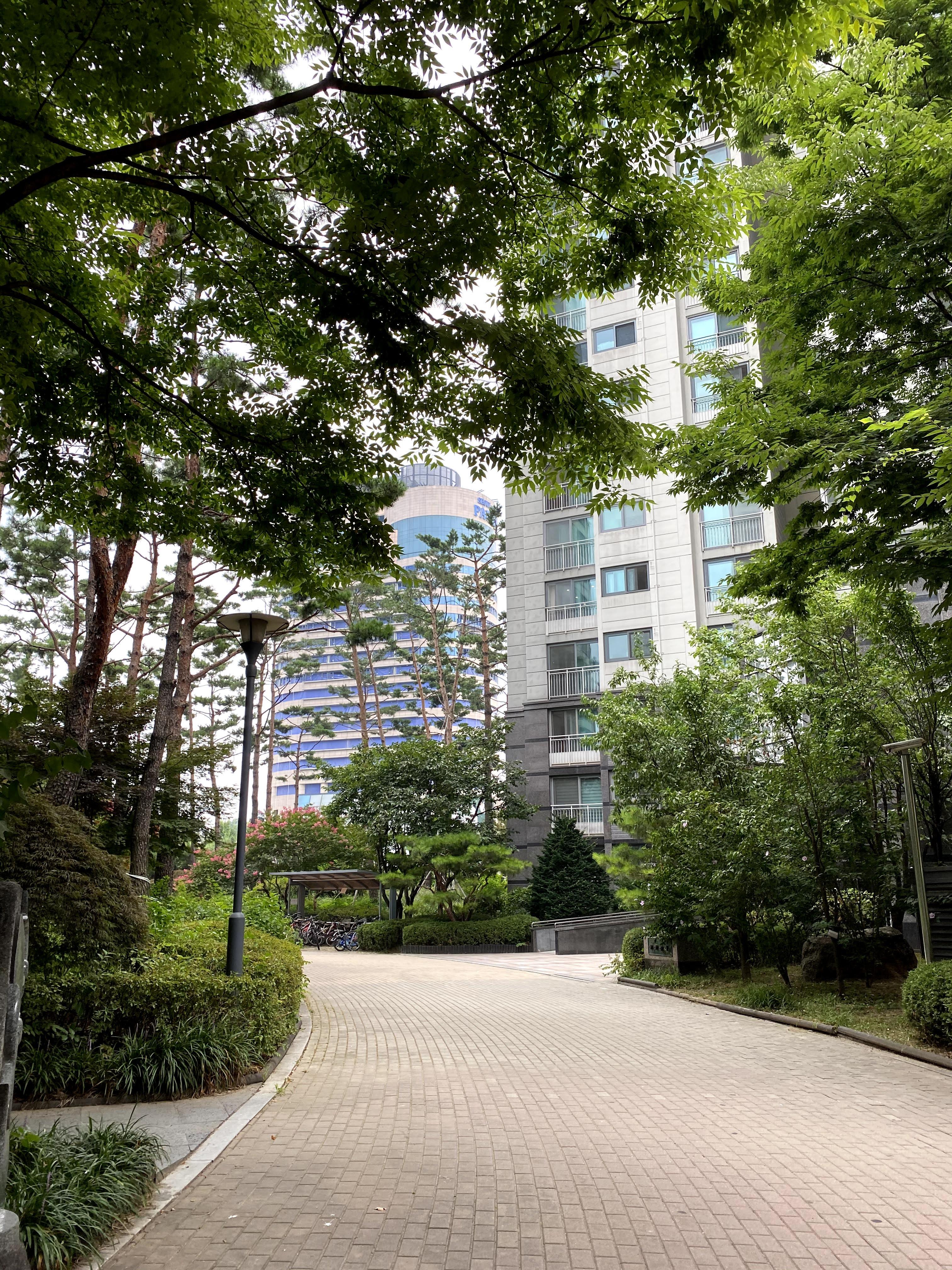 잠실 아파트 파크리오는 조경 대회에서 우승했을 정도로 멋진 조경을 자랑합니다. 아파트 밀도가 높아서 밖에서 보면 상당히 빽빽해 보이는데 단지 내에 들어오면 조경이 잘 되어 있어서 편안합니다.