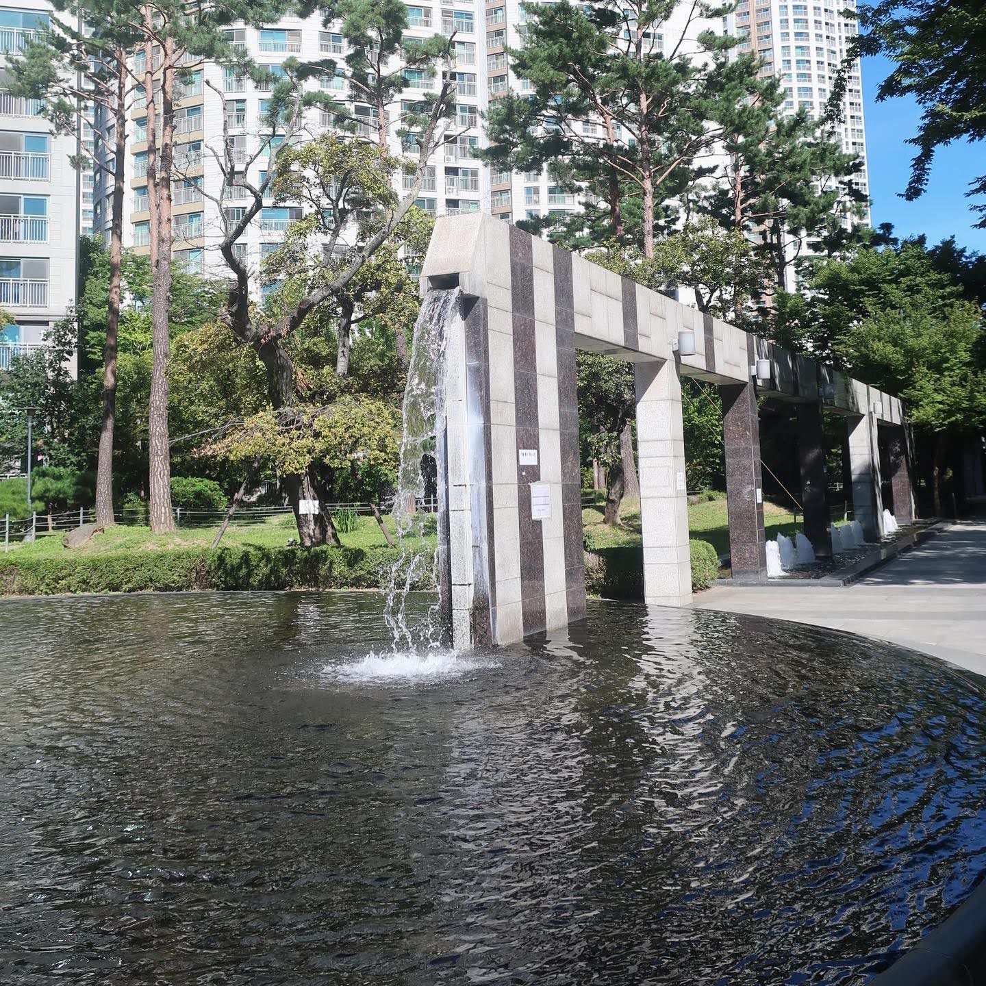 큰 입구와 거울 분수가 있는 잠실 아파트 파크리오 2단지 입니다.