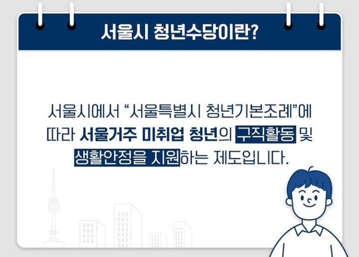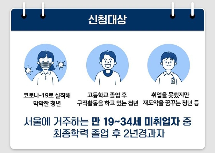 서울에 거주하고 있는 만 19세~34세 미취업 또는 단기 근로 청년에게 활동지원금(월 50만원 최대 6개월)을 지급하고, 경제상담 ·마음상담 · 취업역량강화 교육 등 청년 니즈에 맞게 프로그램 연계를 지속 지원하는 사업입니다.
