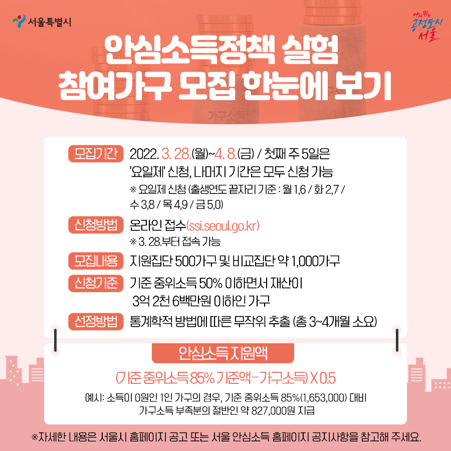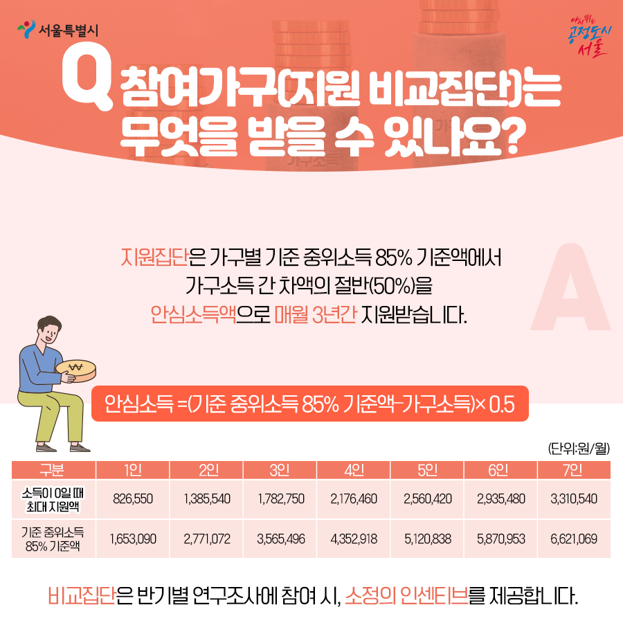 소득이 일정 금액에 미달하는 가구에 대하여 미달액의 일정 비율을 현금으로 지원하는 [안심소득]의 효과성을 확인하기 위해 서울시에서 추진하는 시범사업입니다.