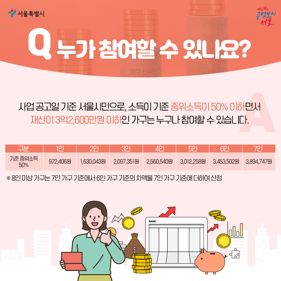 대상: 사업공고일 기준 서울시에 거주하면서 기준 중위소득 50% 이하(소득 하위 25%), 재산 3억 2,600만원 이하인 가구